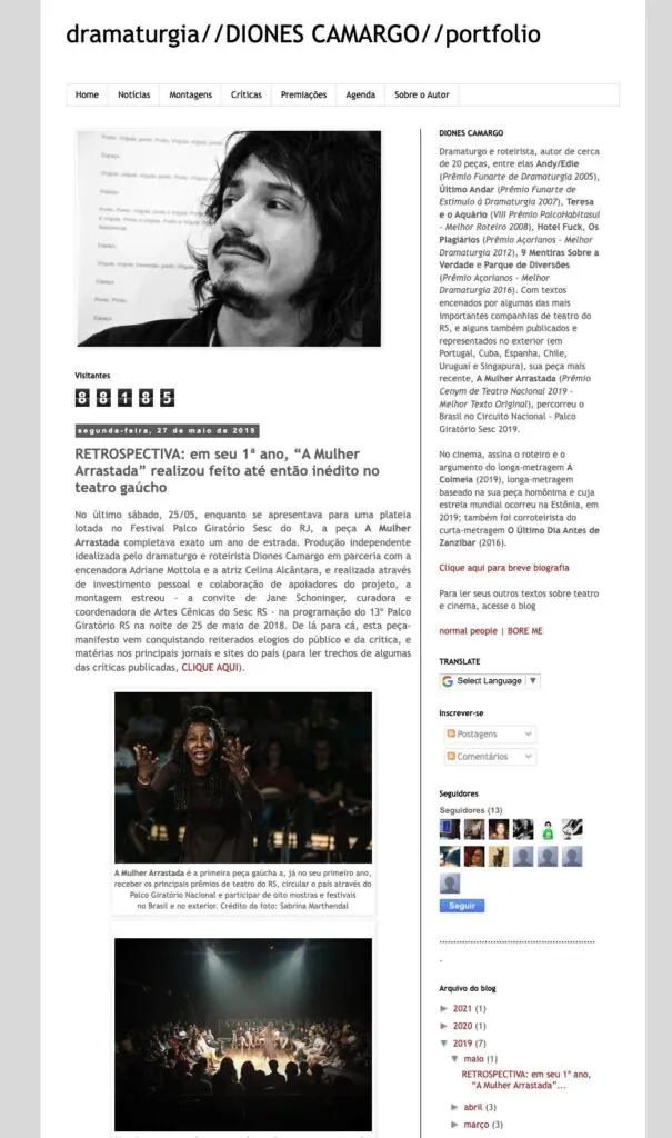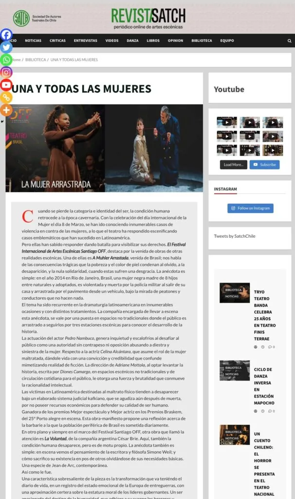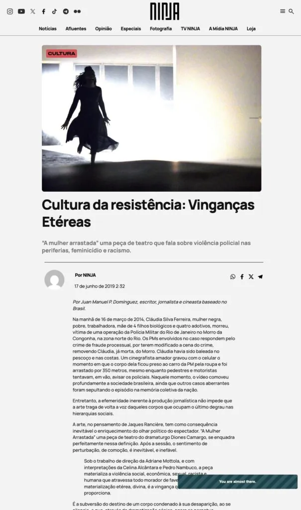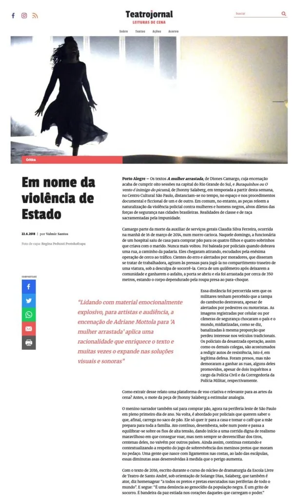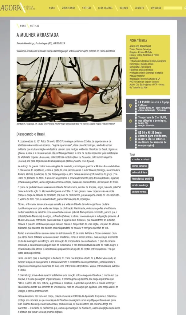A montagem A Mulher Arrastada recorre a uma das inúmeras experiências reais de horror, de violência racista e de letalidade policial nas periferias do Brasil contemporâneo, para denunciá-la com um manifesto cênico-poético doloroso e imprescindível a uma sociedade que se quer democrática.