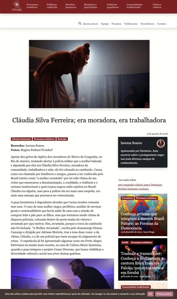 O espetáculo, apesar de não citar diretamente o nome de Cláudia, reclama o direito ao não-apagamento das vozes de mulheres negras vítimas do racismo estrutural e da violência policial em constante estado de normalização. Celina Alcântara, uma mulher negra, tem o seu próprio corpo como território da denúncia e de imagem viva de um corpo coletivo.