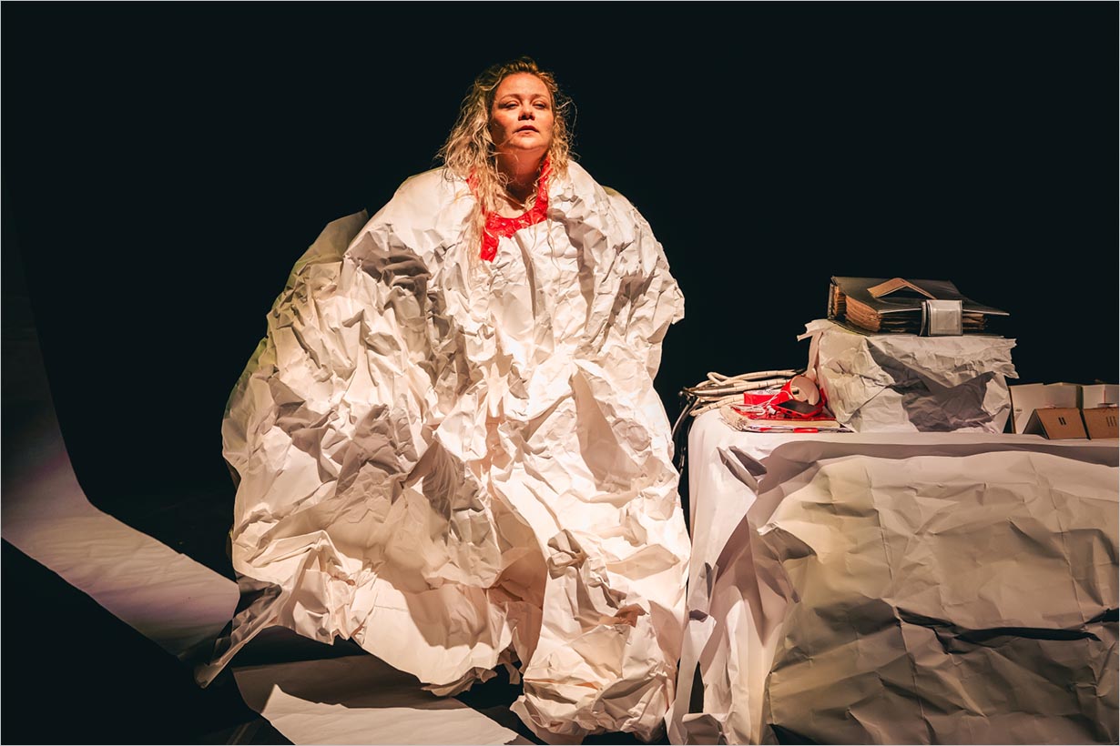 Para Natasha, a parte mais importante de 1 peça cansada é a intimidade e a cumplicidade desenvolvida com os espectadores. Por isso, existe um esforço de eliminar as hierarquias convencionais do espaço cênico, e proposta de outras maneiras de se assistir a uma obra. Outra característica marcante na montagem é o papel. A performer aparece envolta neles e, em cima de uma mesa, estão outros tantos que também estão cansados, como fotos, trabalhos de escola e até a Constituição, “a brasileira mais cansada”, como costuma dizer a atriz.