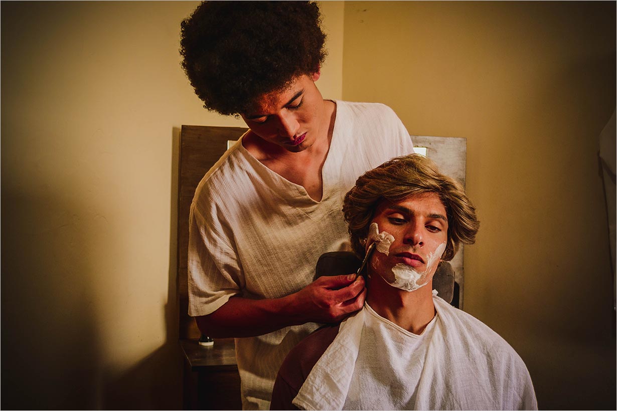 Em cena, um barbeiro calado e de gestos calculados recebe um jovem cliente tímido. O que começa como um simples corte de cabelo se converte em uma atmosfera sufocante, marcada por imposições sutis, manipulação psicológica e tensão crescente. Por meio do estranhamento característico do teatro do absurdo, o trabalho instiga o público a pensar sobre os mecanismos que sustentam relações abusivas, tanto no nível pessoal quanto social e político.