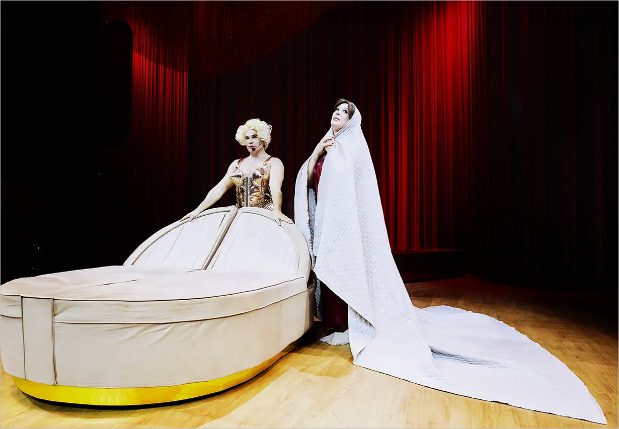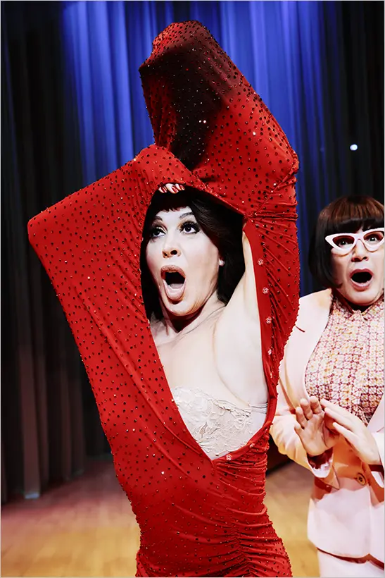 A estrutura do espetáculo acompanha o que a autora chama de “fases do luto ovariano” — choque, negação, revolta, depressão, barganha e aceitação. Cada cena traz uma mulher diferente vivendo um momento-chave da menopausa, e há uma personagem que costura toda a dramaturgia: Teresa.