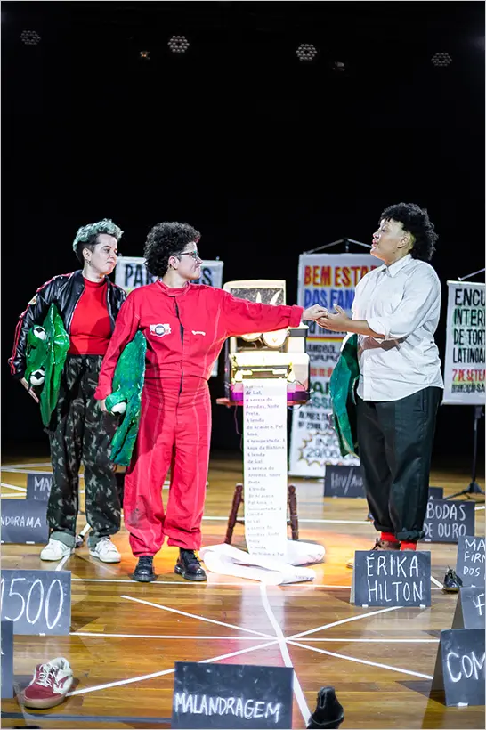 Quatro espetáculos compõem o núcleo das artes cênicas. Em En(tupi)r: Jequitinhonha, o Grupo NaLama constrói uma dramaturgia com música ao vivo e elementos da cultura popular, na qual o protagonismo feminino conduz a colheita da memória e da resistência no Vale do Jequitinhonha. A Breve Cia apresenta assuviá pra chamar o vento, com direção de Amora Tito, obra que atravessa infância, masculinidade e afeto. A House of Juicy Brasil traz A terra dá, a terra quer – Mini Ball, inspirada no pensamento de Nego Bispo, que transforma a pista da ballroom em território vivo de troca e permanência. Encerrando o festival, a própria Coletiva Fanchecléticas apresenta Expedição Reversa, com direção de Marina Viana — obra que mistura poesia, política e humor em uma lesbosapatransgrafia do Brasil.