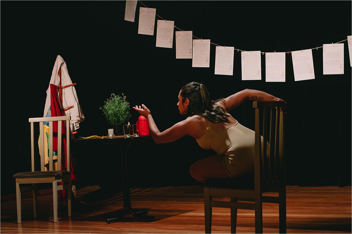 A encenação foi concebida para criar uma atmosfera íntima e acolhedora, aproximando o público da narrativa. Um vaso com ervas, uma vela, um bule de chá e duas xícaras compõem o espaço cênico, que remete ao conforto do lar. Os objetos do cenário minimalista ganham significados simbólicos ao longo da cena. Um cabideiro com figurinos e um varal com algumas das cartas escritas também integram o ambiente, reforçando a ideia de que o amor é também coletivo e compartilhado.