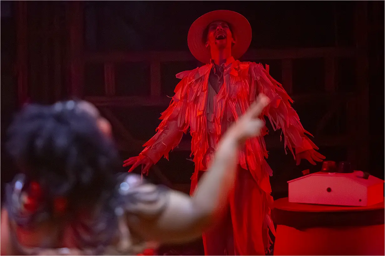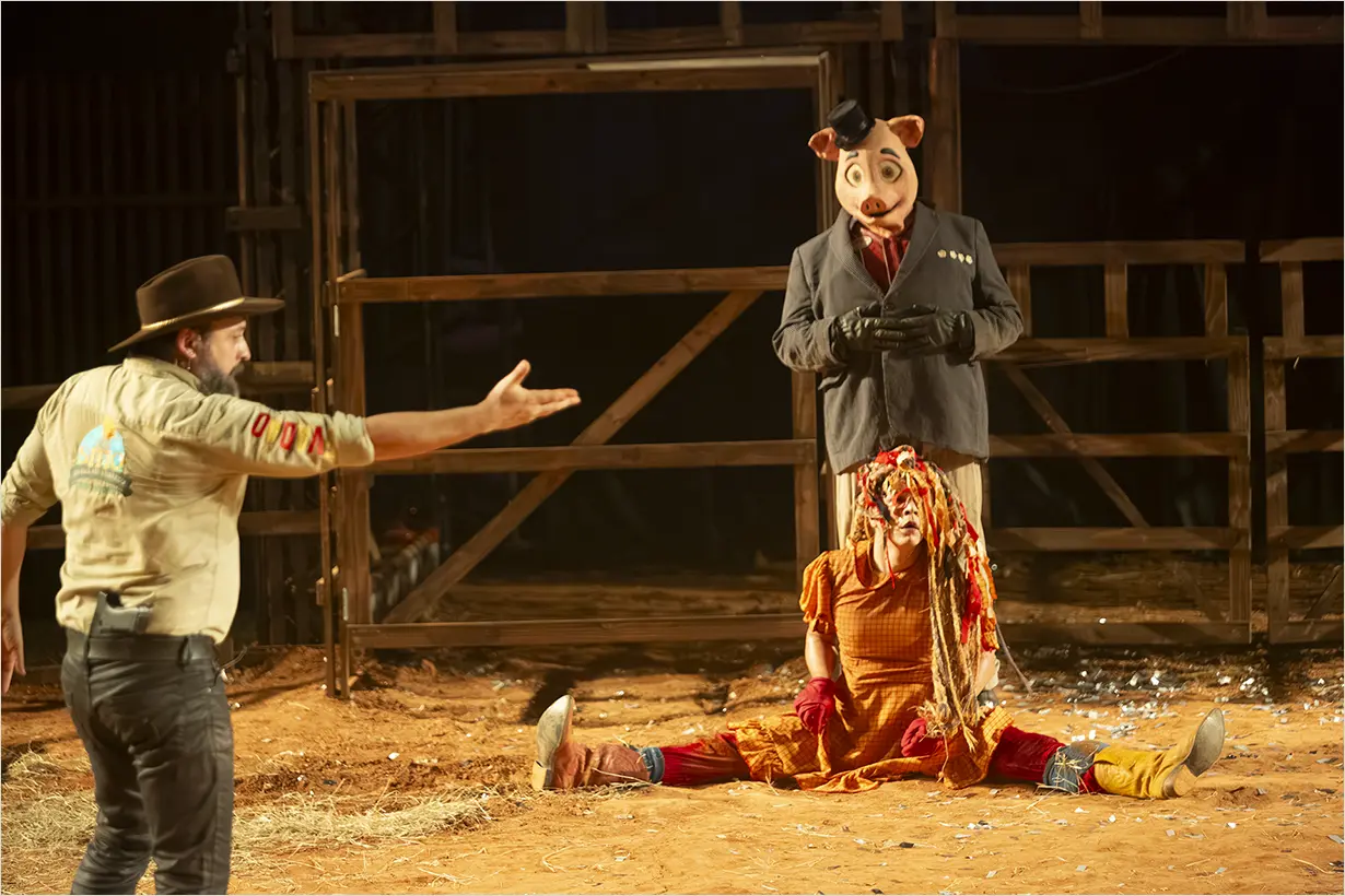 Dividida em três blocos narrados por diferentes personagens, a dramaturgia articula política recente, imaginário rural e herança cultural. O rodeio, pesquisado no processo criativo, surge como metáfora de um Brasil que atualiza estruturas históricas de exploração.