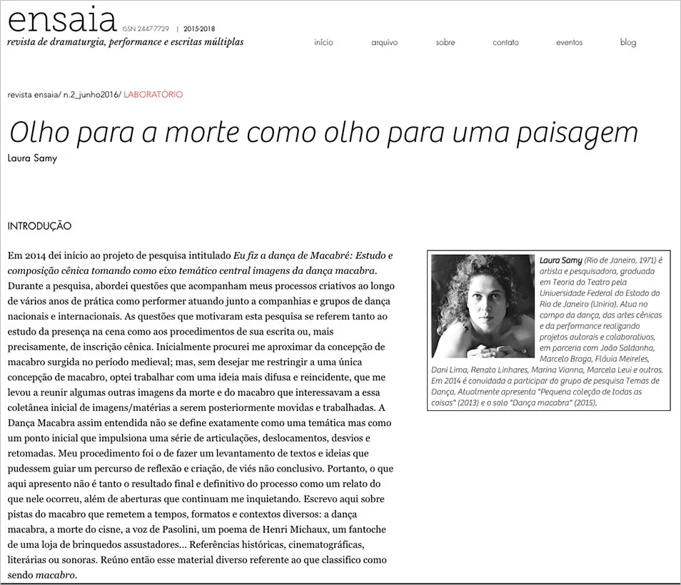 Em 2014 dei início ao projeto de pesquisa intitulado Eu fiz a dança de Macabré: Estudo e composição cênica tomando como eixo temático central imagens da dança macabra. Durante a pesquisa, abordei questões que acompanham meus processos criativos ao longo de vários anos de prática como performer atuando junto a companhias e grupos de dança nacionais e internacionais. As questões que motivaram esta pesquisa se referem tanto ao estudo da presença na cena como aos procedimentos de sua escrita ou, mais precisamente, de inscrição cênica. Inicialmente procurei me aproximar da concepção de macabro surgida no período medieval; mas, sem desejar me restringir a uma única concepção de macabro, optei trabalhar com uma ideia mais difusa e reincidente, que me levou a reunir algumas outras imagens da morte e do macabro que interessavam a essa coletânea inicial de imagens/matérias a serem posteriormente movidas e trabalhadas. (…)