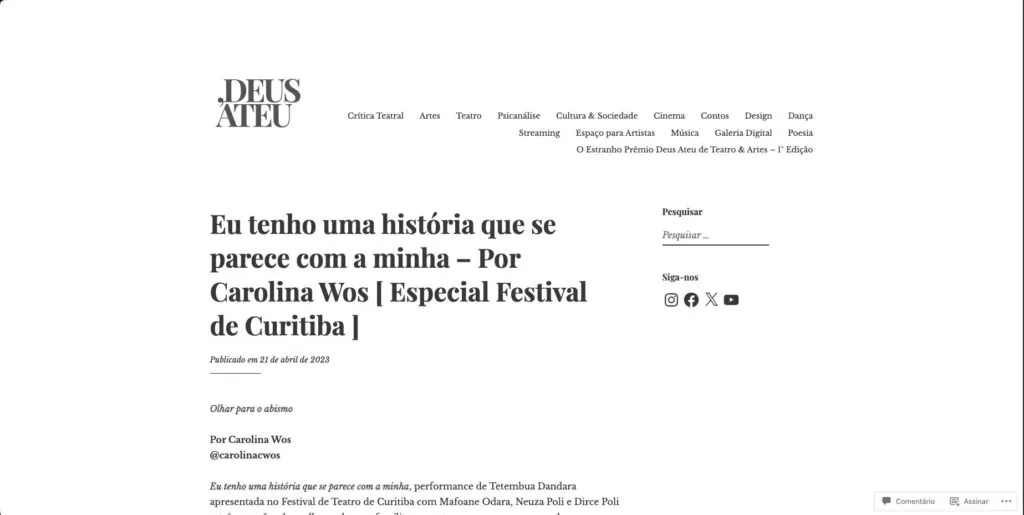 Esta é a página de um espetáculo selecionado no âmbito do projeto O teatro e a democracia brasileira. As informações nela contidas são de responsabilidade de Tetembua Dandara, excetuando-se o texto do curador do projeto, sendo esse de responsabilidade da Foco in Cena, proponente deste projeto. Caso encontre um erro ou divergência de dados, favor entrar em contato através do e-mail contato@focoincena.com.br