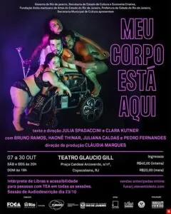 The play “My Body Is Here” brings an original theme: affection and sexuality in bodies with disabilities. It is an unprecedented theme on stage and dives into reflecting on these bodies that are “marginal”, silenced, and socially denied. The body of a person with a disability is rarely explored as an object of love or sex, whether on stage, on TV, or in the movies.