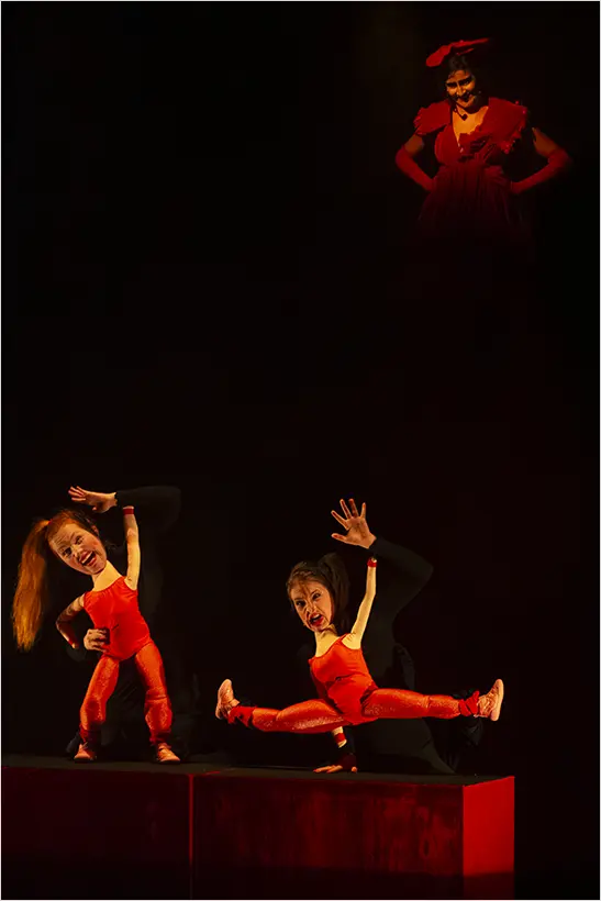 O espetáculo também conta com uma cena em que as duas meninas, Liz e Carol, são manipuladas pela Aurora, “aí eu brinco que elas são as choronas, que são as bonecas manipuladas”, brinca Byron O’Neill, diretor e dramaturgo.