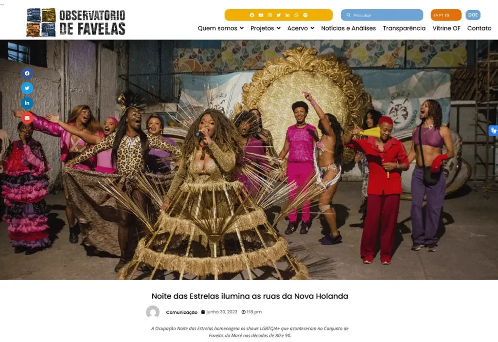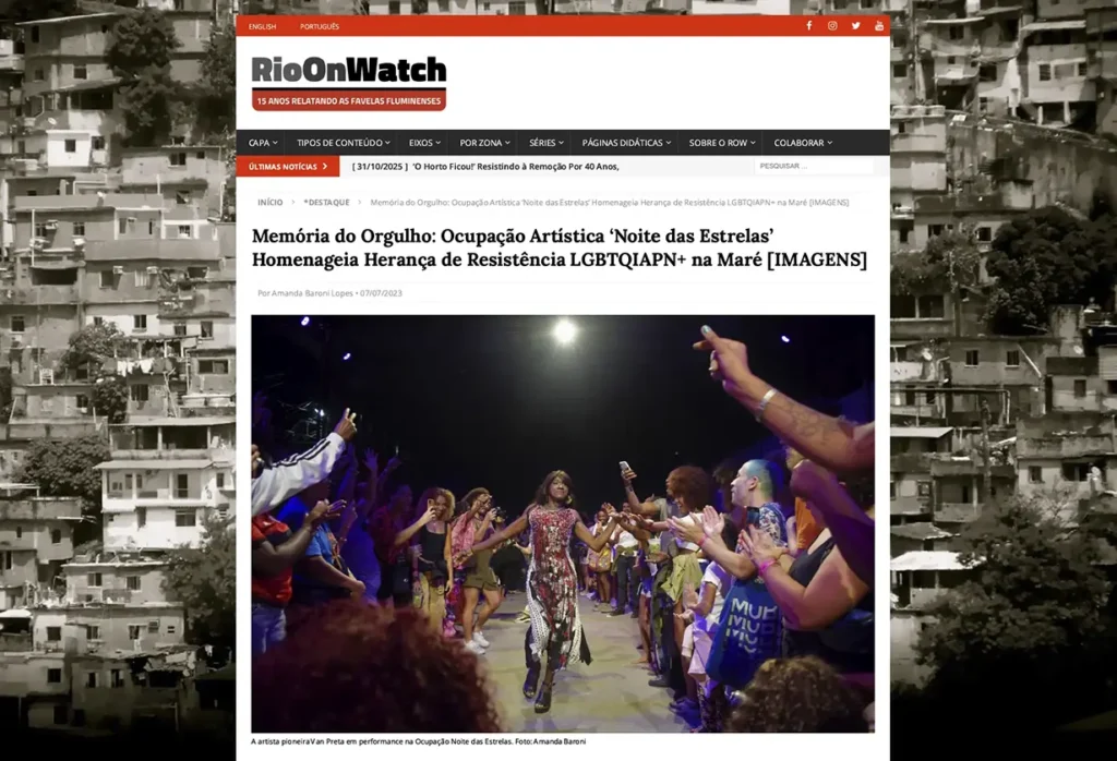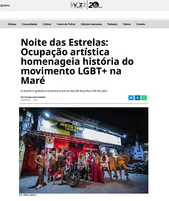 Entendo que um fluxo desse movimento é o lugar onde a Entidade Maré propõe o espetáculo-happening A noite das estrelas, uma celebração única LGBTQIAPN+, realizada no Complexo de favelas da Maré, particularmente na Nova Holanda, para celebrar a vida e a obra de artistas que se destacaram dentro da comunidade nos anos 80 e 90 do século XX.