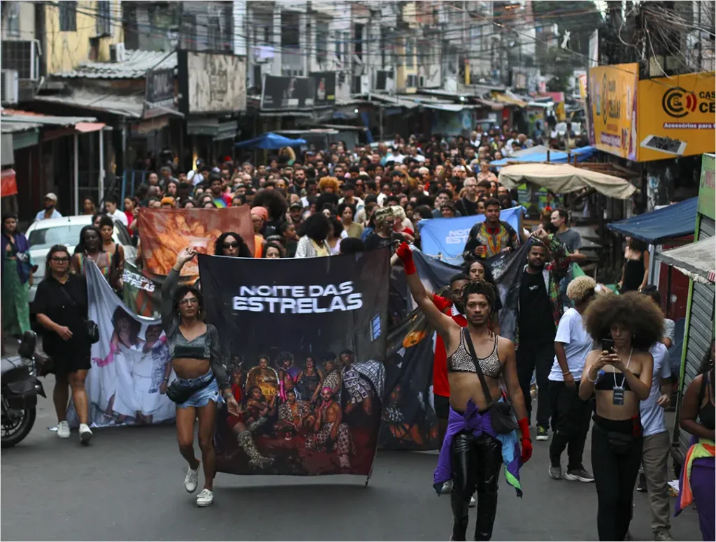 Tudo começou quando Ney, uma bixa preta que organizava a festa junina do Rubens Vaz, atendeu o desejo de suas amigas travestis que o ajudavam a confeccionar as roupas da quadrilha: ceder um dia da festa para elas realizarem um show. Aquele show foi um grande sucesso. Menga, uma bixa que era pai de santo e ligado ao carnaval, viu aquele movimento e batizou-o como “Noite das Estrelas”, firmando um movimento que durou mais de 20 anos pelas favelas da Maré, por outras comunidades e lugares da cena LGBTQIAPN+ da cidade do Rio de Janeiro. Um tipo de movimento que tinha a rua firmada como cena dos palcos, com a performance dos corpos gravada na celebração que arrastava multidões.