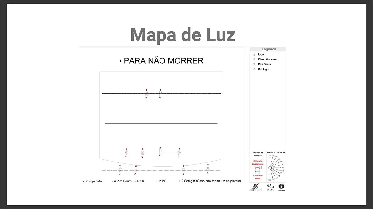 4 Peanbean (fornecidos por nossa produção) ou 4 elipsos + 2 Par#5 + 1 mesa com ao menos 12 canais de dimmer.