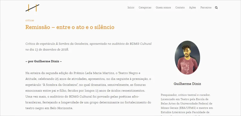 Em seu mestrado, Guilherme Diniz investigou a fortuna crítica do Teatro Experimental do Negro (1944-1968), discutindo as bases ideológicas ali presentes. As análises objetivaram identificar e debater tanto as visões político-sociais quanto as ideias artísticas existentes no jornalismo cultural que se debruçou sobre o TEN. A pesquisa foi orientada pela Profª. Dra. Elen de Medeiros.