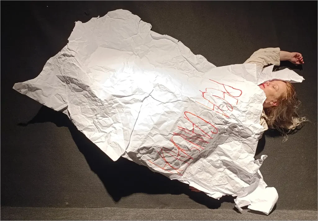 Outra presença marcante na montagem é o papel. A performer aparece envolta neles e, em cima de uma mesa, estão outros tantos que também estão cansados, como fotos, trabalhos de escola e até a Constituição, “a brasileira mais cansada”, como costuma dizer a atriz.