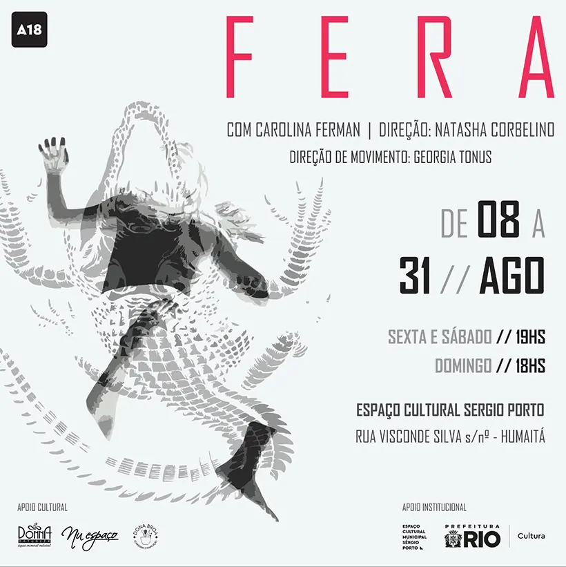 Livremente inspirado em O Olho do Crocodilo, da filósofa australiana Val Plumwood, “FERA” leva ao palco um episódio real: o ataque que Plumwood sofreu de um crocodilo no parque nacional de Kakadu, na Austrália. Em cena, esse instante anterior à morte, quando ela encara o animal nos olhos, é expandido poeticamente. Dirigida por Natasha Corbelino, a atriz Carolina Ferman contracena com uma caixa de som, transformando o solo em duo, e ampliando a ideia de um espetáculo que acontece no “entre”: o humano e o selvagem, a natureza e a máquina, a vida e a morte.