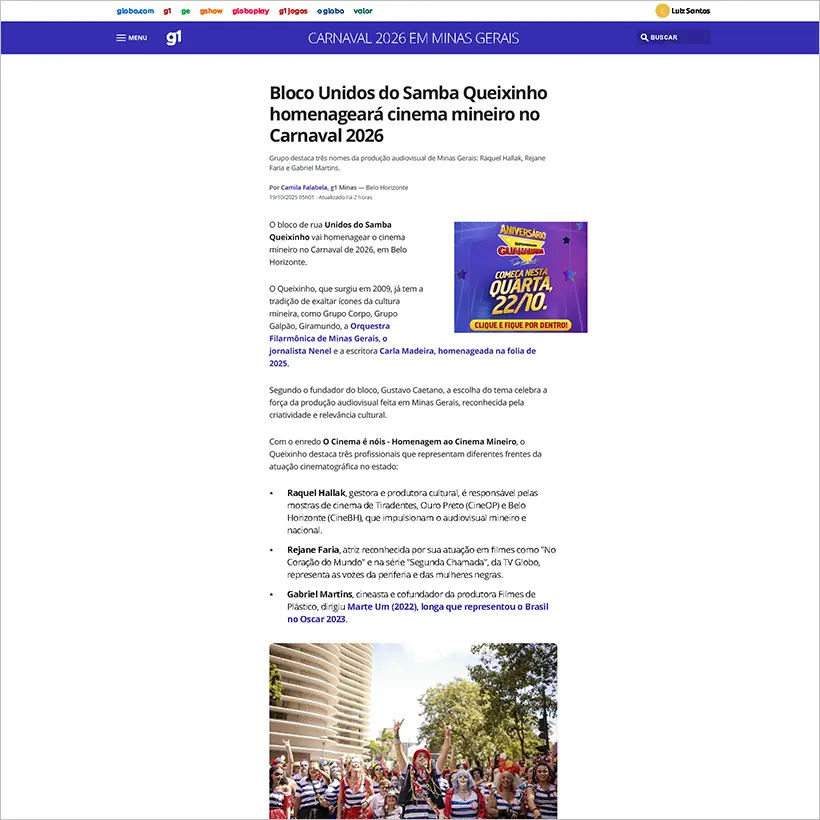 O bloco de rua Unidos do Samba Queixinho vai homenagear o cinema mineiro no Carnaval de 2026, em Belo Horizonte.