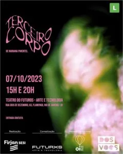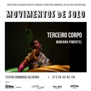 “Terceiro Corpo” é um solo de dança criado pela artista da dança, curadora e gestora cultural Mariana Pimentel em uma parceria criativa com a atriz e iluminadora Karina Figueredo, na qual investigam a relação entre corpo, luz e visualidades como dramaturgia central do espetáculo. A morte da avó de Mariana disparou de maneira muito intensa um processo de retomada ancestral no seu percurso pessoal e artístico. Sua avó se chamava Moema. Sua mãe se chama Moema. E Moema também quase foi o seu nome. Moema é uma mulher indígena presente na obra de autoria do padre e poeta Santa Rita Durão de título “Caramuru: poema épico do descobrimento da Bahia”(1829), que relata sob a perspectiva do colonizador a chegada do português Diogo Álvares Correia ao Brasil e a “conquista” da Bahia. Ela é considerada como símbolo de uma mulher heróica, destemida e persistente ao nadar até a morte em direção à caravela do seu amado Caramuru enquanto ele partia de volta à Portugal levando consigo sua irmã Paraguaçu. Caramuru manteve relações amorosas com as duas irmãs, elegendo uma delas para casar-se consigo em Portugal.