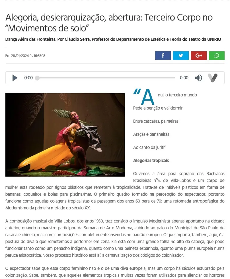 (…) O espectador sabe que esse corpo feminino não é o de uma diva europeia, mas um corpo há séculos estuprado pela colonização. Sabe, também, que aqueles elementos tropicais muitas vezes foram utilizados para silenciar os horrores coloniais com uma ideia de povo brasileiro alegre, que faz carnaval mesmo sob a pobreza. Sabe que o material plástico é agressivo à natureza e, por isso, ele materializa, em cena, nosso papel de objeto aos olhos dos que contaram a História. (…)